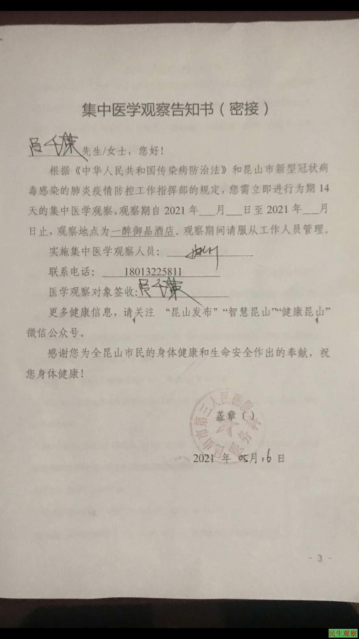“当天晚上,我在三兴旅馆认识了同在该旅馆住宿的,也是来参加王和英茶庄开业典礼的广西的陆辉煌。在三兴旅馆休息了一晚上,第二天(5月16日)因早上下雨,早上8点雨停后,我和陆辉煌出去想到中和新村溜溜看看,结果又被昆山公安局国保大队等警察辅警七八人拦住,其中一个拦我们的人的警号是:243339,然后我和陆辉煌都在没有任何手续的情况下,被抓到了青阳派出所,我被关进了酒店医学隔离点进行隔离十四天,警察说隔离费自负,我说你们地方政府非要隔离我,我没钱给隔离费,后来隔离费由地方政府付。”吕千荣说。