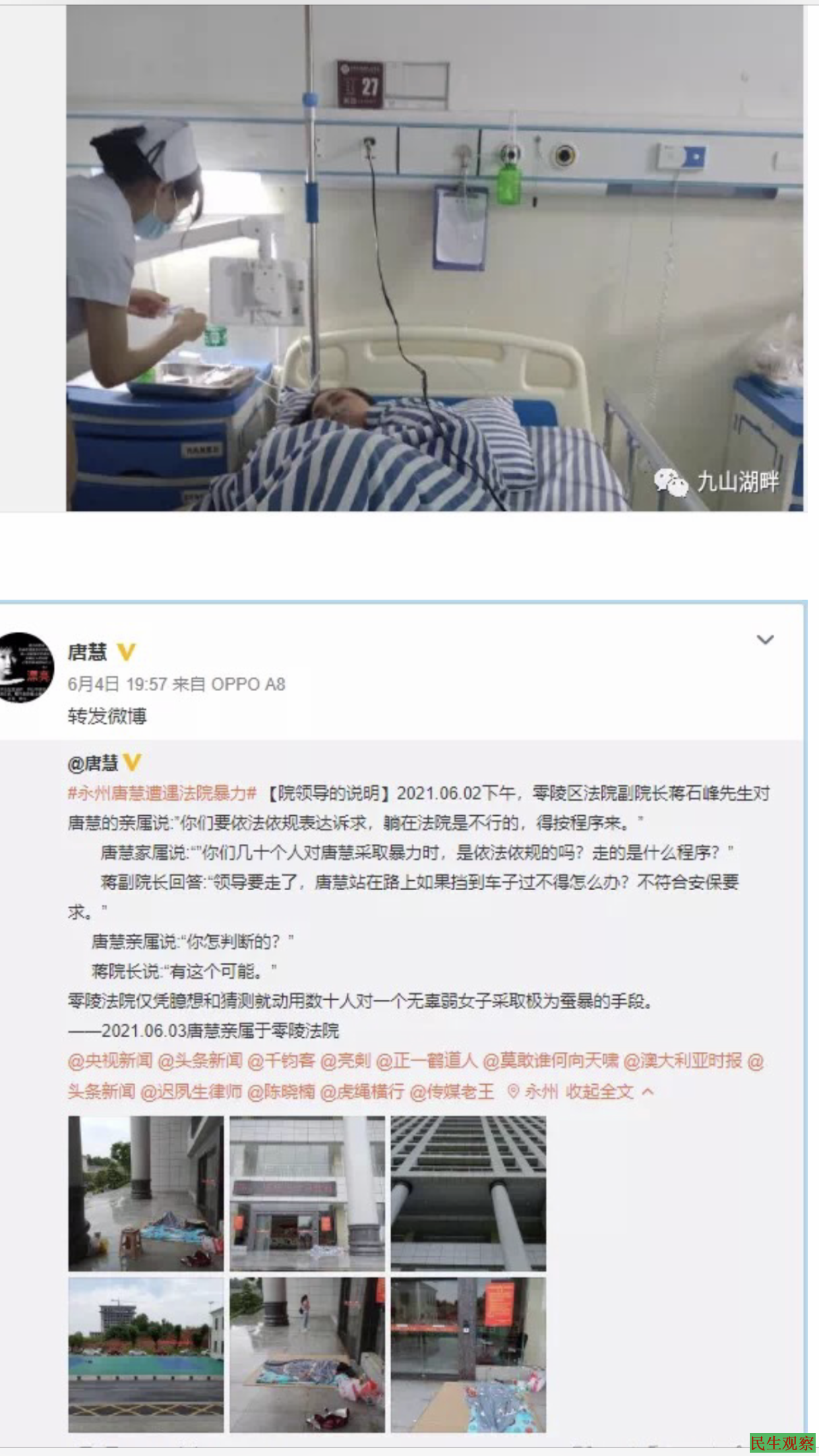 【民生观察2021年6月7日消息】近日,湖南永州上访妈妈唐慧到零陵区人民法院办事,无辜遭到法院数十人的拦截拉扯,致其倒地,造成唐慧头部受伤,为了维护自己的尊严和权利,唐慧在法院门前绝食表达抗议。