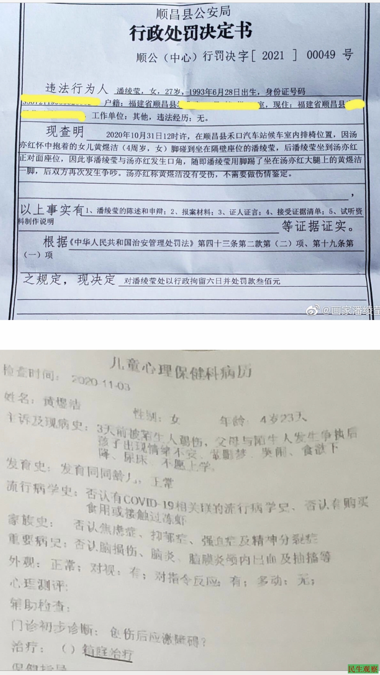 今天要诉说的是我的遭遇:2020年10月31日,我在福建省顺昌县汽车站侯车,一位刚喝完酒的妇女抱着四周岁的女儿坐在我旁边,其女儿踢了我,我就另换座位。故事如此简单,却是我恶梦的开始。