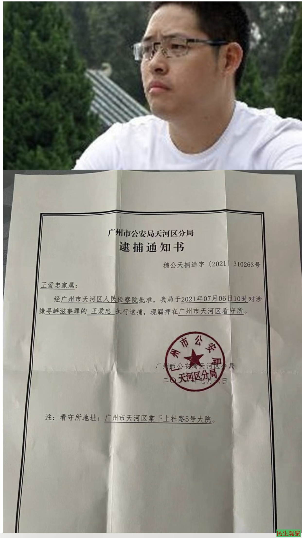 2021年5月29日,王爱忠被广州市公安局天河区分局以涉嫌寻衅滋事罪刑事拘留。随后,9名警察到王爱忠家搜查,向王爱忠妻子王贺楠出示了搜查证,搜走29本书,两台电脑,一部手机。王的岳母受到惊吓。随后,还将王妻传唤到派出所,询问王爱忠的交往及言论情况,并警告勿发声。