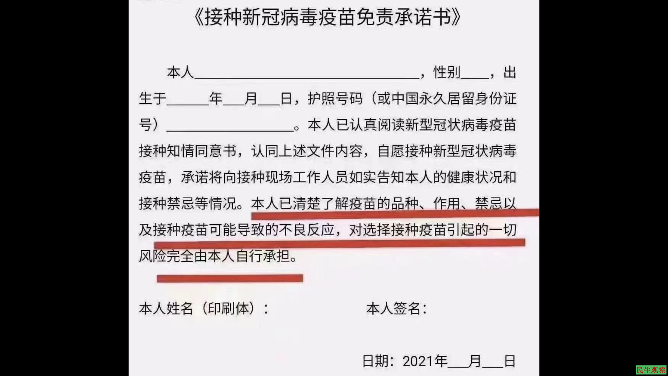 【民生观察2021年8月3日消息】近日,全国各地强制或变相强制要求民众接种新冠病毒疫苗,却接二连三出现事故。据说,现在接种的都是实验性疫苗,风险很高,而民众在接种之前,都会被要求签署《接种新冠病毒疫苗免责承诺书》,政府将其责任推的一干二净。网友质疑,目前新冠疫苗还在临床实验阶段,政府就强推要求民众接种,但一切风险由民众自己承担,完全漠视民众生命健康权,这合理合法吗?