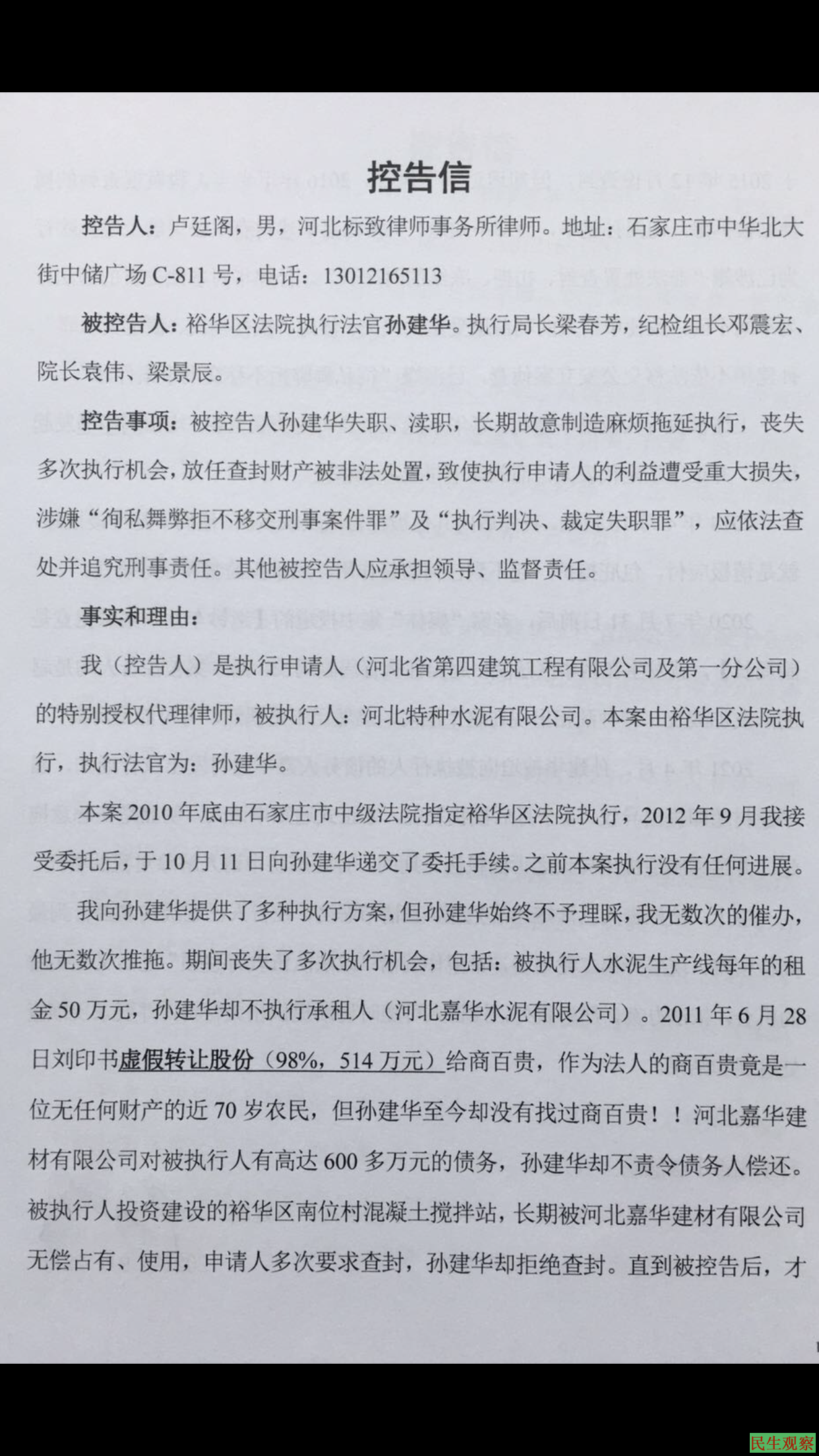我(控告人)是执行申请人(河北省第四建筑工程有限公司及第一分公司)的特别授权代理律师,被执行人;河北特种水泥有限公司。本案由裕华区法院执行,执行法官为:孙建华。