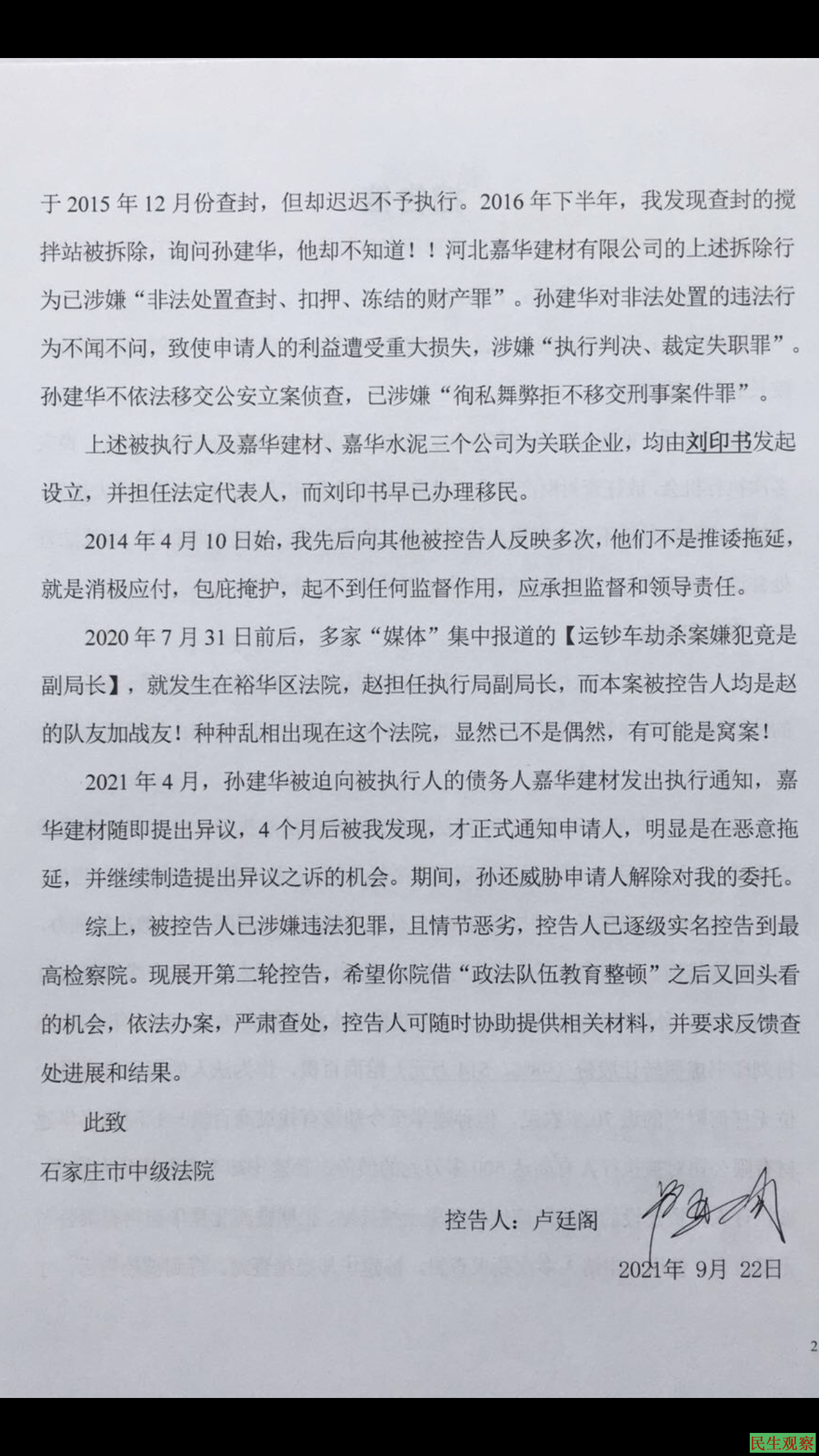 卢廷阁:代理2执行案,法院10年不执行,投诉控告6年不理,开始第2轮:向石家庄市中级法院控告。