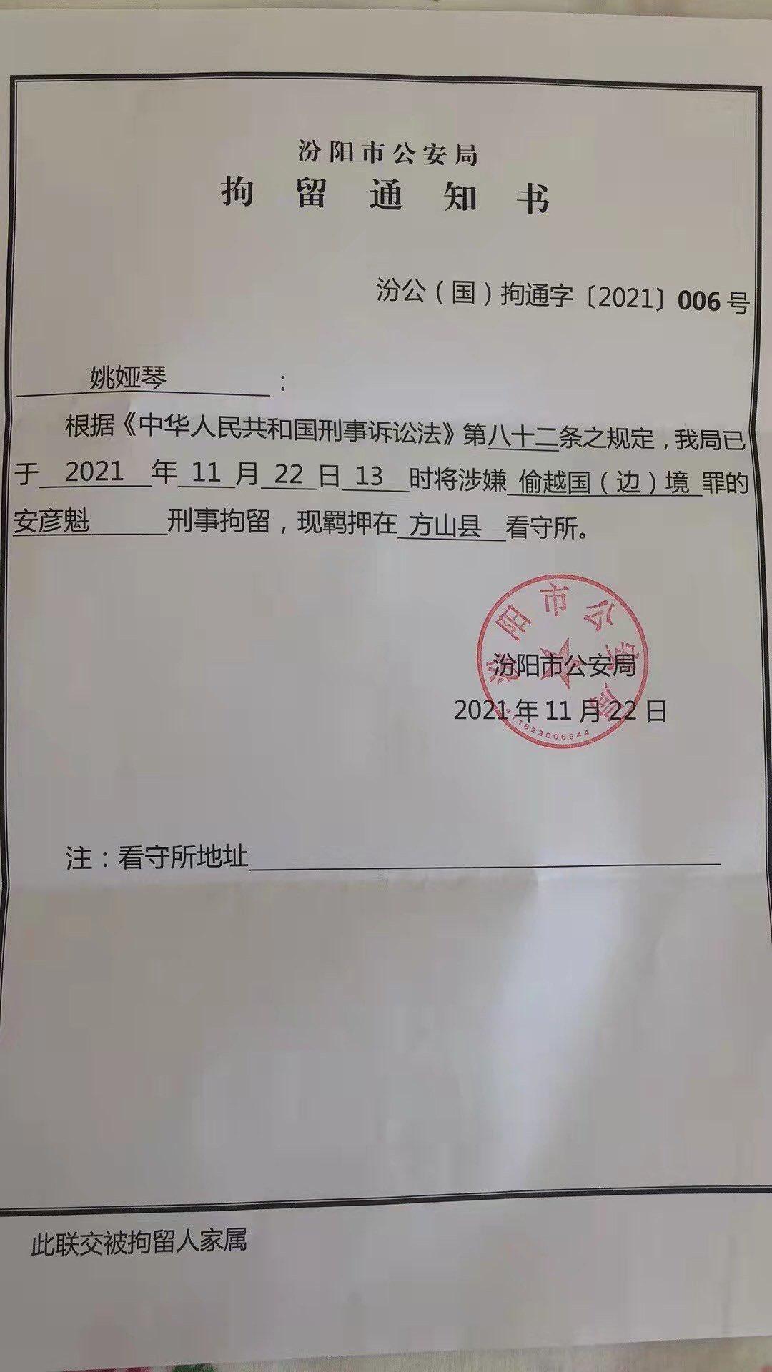 今天(11月24日)上午,安彦魁传道的妻子姚聪娅姊妹收到了刑事拘留通知书。姚聪娅说:“谢谢各位为我们祷告和陪伴的亲人。2021年11.21日主日中午,一家人高高兴兴的带着邀请的客人准备回家吃饭,一出电梯(早上走的时候锁了三道保险的门)家门大开,床板旋开,一大群人在家里,有几位穿着警服。我们问:为什么撬门入室,请出示证件,我没有看到有人出示证件。听到有一位回答:我们的衣服就是证件,有六七个穿警服的人就把我老公按住押出去了,剩下的人有一位自称是汾阳的男士(因我向他要证件,他没出示)让我看了搜查证,就开始在家里找东西,最后拿走了所有电子产品还有一些书籍,但没留下任何清单或其它通知,直到今天上午收到这份拘留通知……”