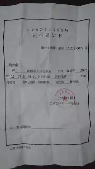 2021年9月底,“国庆节”前夕,其突然被江西省吉安警方秘密抓捕,后知被以涉嫌“寻衅滋事罪”刑拘;2021年11月9日,家属收到逮捕通知书,得知其于2021年11月5日被吉安市公安局青原分局以涉嫌“寻衅滋事罪”执行逮捕,拘押至今,未予释放。其亲属遭恐吓均被禁言,不愿意透露更多信息。目前被羁押于江西省吉安市看守所。