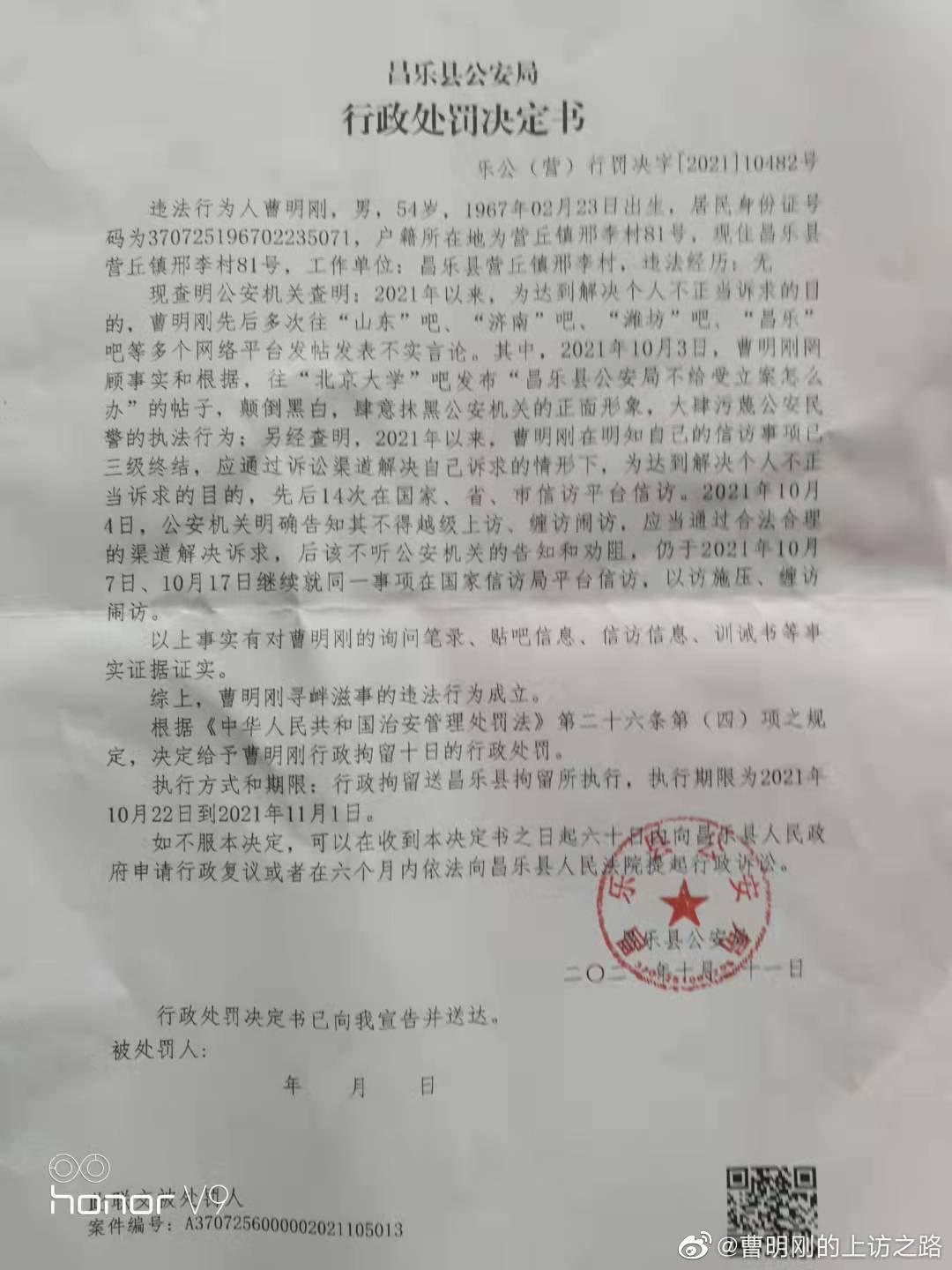 曹明刚反映,他在国家信访局的网上投诉也被有关部门删改了上访次数。由于从2021年6月6日开始至今人身自由被限制,所以他只能在网上访,连续访过几次后,突然,从2021年10月22日至2021年11月01日他被昌乐县公安局行政拘留十日,理由是“寻衅滋事”。