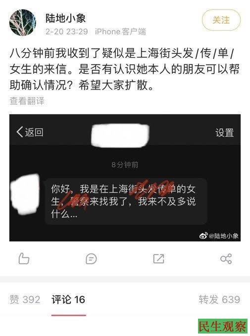 另外,2022年2月20日,微博名为“陆地小象”的用户发出消息称:八分钟前,我收到疑似是上海街头发传单女生的来信,称自己被警察上门找。是否有认识她本人的朋友可以帮助确认情况?希望大家扩散。