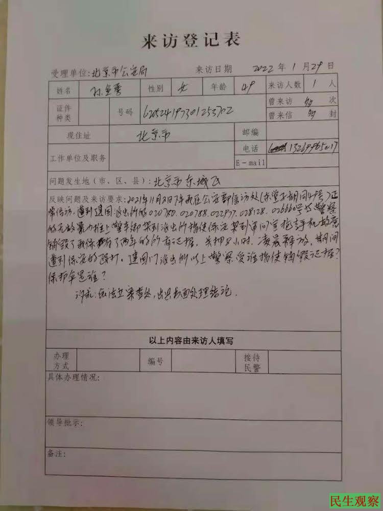 2022年元月27号在国家信访局被非法拦截不让进去后,孙金秀继续到北京市公安局信访局登记投诉在北京维权长期被北京市公安警察打击报复,多次遭到北京警察的殴打,还多次遭到北京警察的非法拦截,把访民当铁链女一样卖给地方被地方遣返回去迫害。
