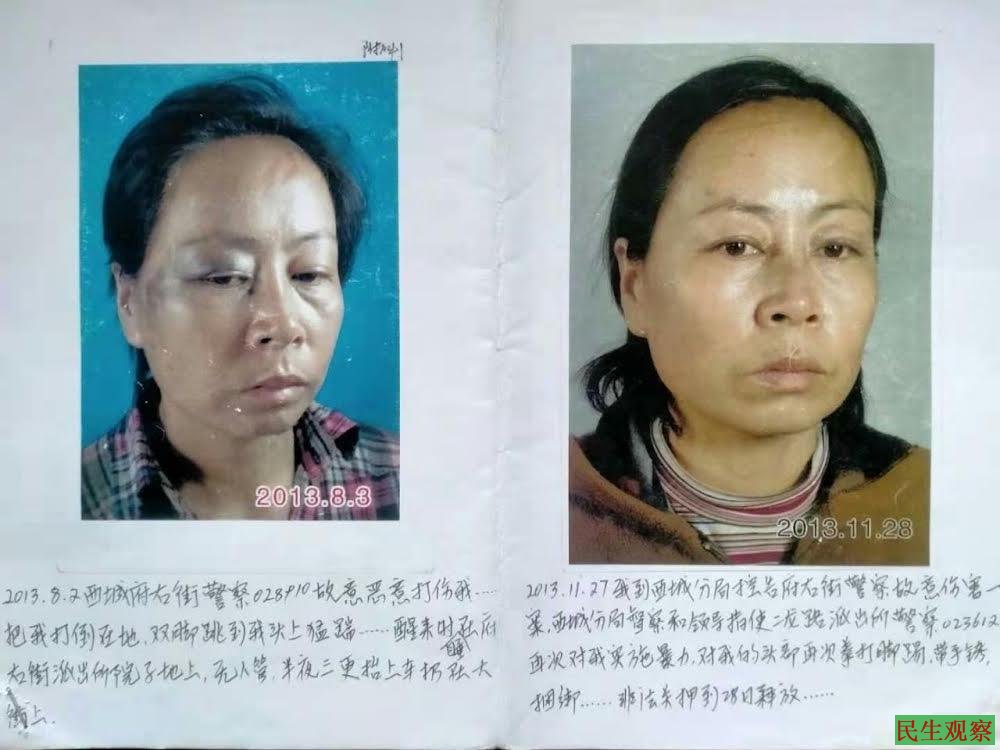 2016年1月至3月多次去北京市公安局信访局要书面答复,都是被拒绝和打骂、侮辱。3月16日,被警号019907的恶警殴打致左腿不能行走、衣服撕烂。警号000759的说:怎么都不给你书面材料,就是打你,还要处理你。于是造假让甘肃警察拘留孙金秀10天。武山县城关派出所所长说:“北京没法律,武山有法律,我们要替北京公安处理你,我们要替北京公安管住你。”