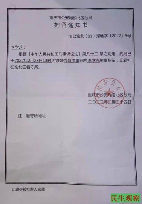 【民生观察2022年3月16日消息】因公开官员称不关心老百姓死活的视频,重庆李学志2月23日被抓捕。
