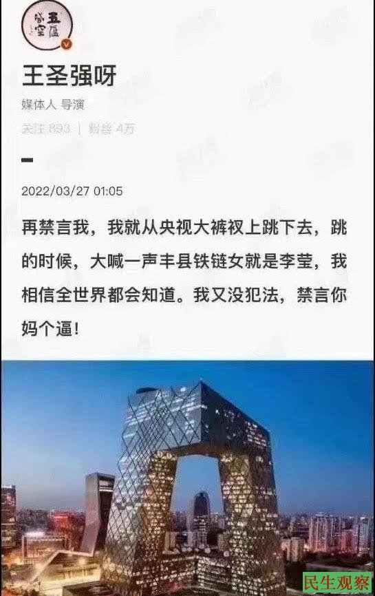 当天,他还在微博上被气到爆出脏话:“再禁言我,我就从央视大裤衩上跳下去,跳的时候,大喊一声丰县铁链女就是李莹,我相信全世界都会知道,我又没犯法,禁言***个X!”但这个帖文已被删除。