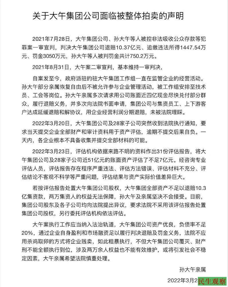 【民生观察2022年3月31日消息】2022年3月28日,孙大午亲属发布一则《关于大午集团公司面临被整体拍卖的声明》,引发广大网友评论。3月30日,孙大午次子孙福硕发布呼吁令事件进一步发酵。孙福硕表示,自愿以7.5亿元的低价抛售大午种禽公司45%的股份,以避免大午集团公司被贱卖,以求尽快终结执行程序,恢复大午集团的正常经营。据悉,大午集团将于2022年4月11日被司法拍卖。