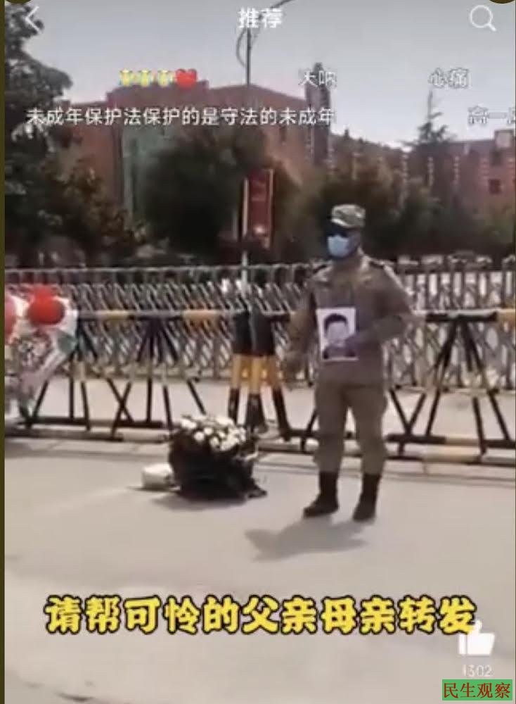 视频中,死者父亲在渔沟中学校门口拿着儿子的遗像在哭诉:“我保卫祖国15年,光溜溜仅一个孩子,在学校被打死了!”