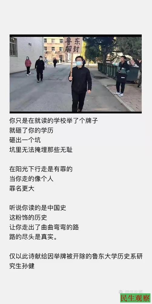 【民生观察2022年4月4日消息】2022年3月27日,山东省烟台市是鲁东大学在读研究生孙健,因为在校园举牌要求解封,被当地警方处以警告行政处罚。3月31日,孙健遭到鲁东大学开除学籍处分,随后他本人发出致鲁东大学的檄文一封!