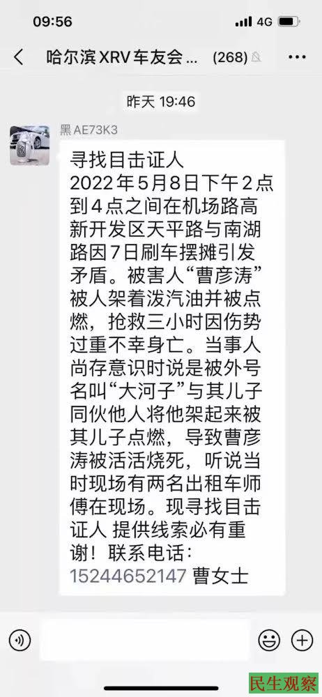 【民生观察2022年5月15日消息】2022年5月8日下午,哈尔滨男子曹彦涛因摆摊洗车引发矛盾,疑被同行当街浇汽油烧伤,在抢救三小时后因伤势过重不幸身亡,死者生前曾向家人讲述自己被多人架起来浇上汽油点燃,家属网络求助寻找目击证人。5月12日,哈尔滨警方发布警情通报,同时对家属进行多次询问并没收手机,要求家属承认之前在网上爆料的都是假话,不准和媒体联系。
