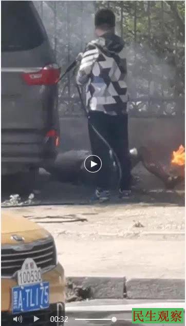 网上一段视频显示,曹女士哥哥被烧的地方,是在一个路边,旁边还有出租车经过,还有多名目击者。
