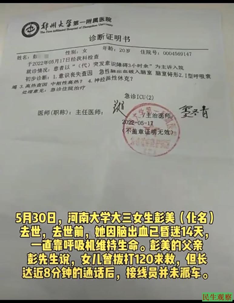 【民生观察2022年6月5日消息】日前,河南大学一学生突发疾病,自己打急救中心电话。接线员在明知她位置的情况下仍然反复确认,在对方已经十分痛苦的情况下说:我感觉你没啥事,最终救护车两个半小时后才到,还被宿舍管理员要求登记,这一连串的不专业操作耽误病情导致该学生死亡,本来完全可以救回来的。而距离最近的郑大附院,仅有十分钟车程。