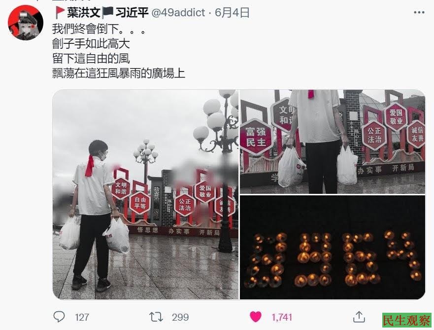 【民生观察2022年6月9日消息】2022年6月4日是“六四天安门事件”33周年,推友葉洪文去广东汕头人民广场祭奠,并拍下“坦克人”的照片,这位英勇的左派青年,目前已经失踪五天了,疑似已被捕。