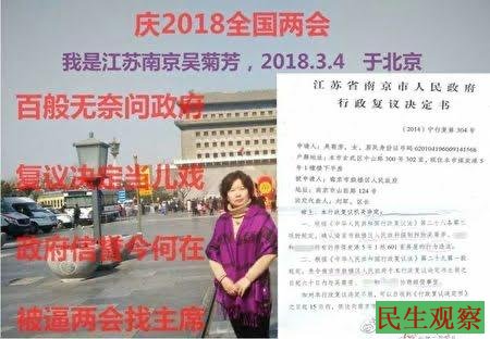 据了解,吴菊芳位于南京市鼓楼区两证齐全的合法房屋被鼓楼区政府违法毁灭了,被法律生效判决确认违法,并责令鼓楼区政府赔偿,但是至今鼓楼区政府不履行判决。各级信访局不处理,法院不执行强制手段。十年了,政府依然没有被追责,吴菊芳却被各种手段不断的迫害。
