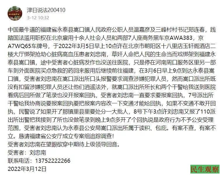2022年3月5日早上10点许,福建省永泰县嵩口镇人民政府公职人员及三峰村村书记郑连春,在北京雇佣十余社会人员和两部7人座商务黑车(京AWA383、京A7WQ65),进入北京市朝阳区十八里店玉轩阁酒店二楼大厅将刘忠南绑架,因刘忠南患有心脏病高血压,途中其心脏病发作也没送往医院,只是停在河南周口服务区里,另一部车到外面医院买了一点急救的药回来,刘忠南服用后继续前往福建。