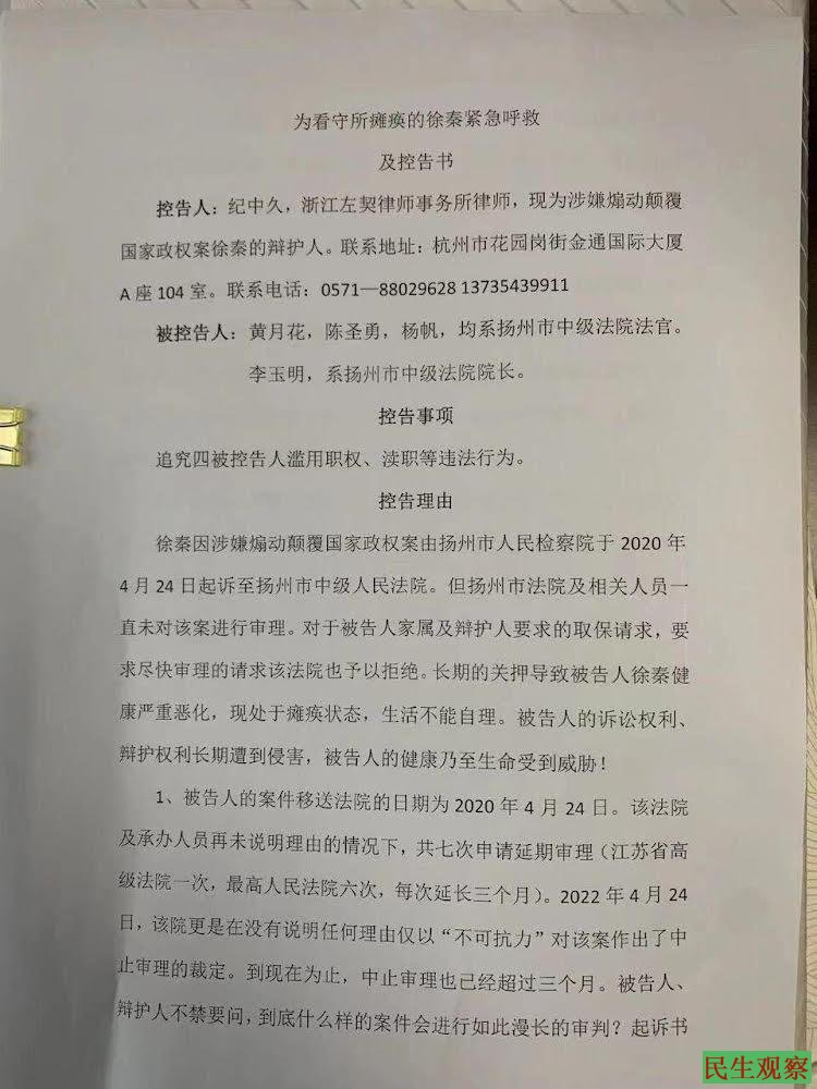 纪中久律师称,徐秦因涉嫌煽动颠覆国家政权案由扬州市人民检察院于2020年4月24日起诉至扬州市中级人民法院。但扬州市法院及相关人员一直未对该案进行审理。对于被告人家属及辩护人要求的取保请求,要求尽快审理的请求该法院也予以拒绝。长期的关押导致被告人徐秦健康严重恶化,现处于瘫痪状态,生活不能自理。被告人的诉讼权利、辩护权利长期遭到侵害,被告人的健康乃至生命受到威胁!