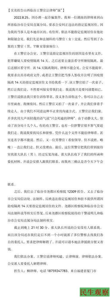 2022年8月25日,家属委托两位律师前往会见当事人,被告知在疫情隔离阶段不能会见,王警官说律师死磕,让律师滚。两位律师依法实名控告山西临汾警官对律师态度恶劣。