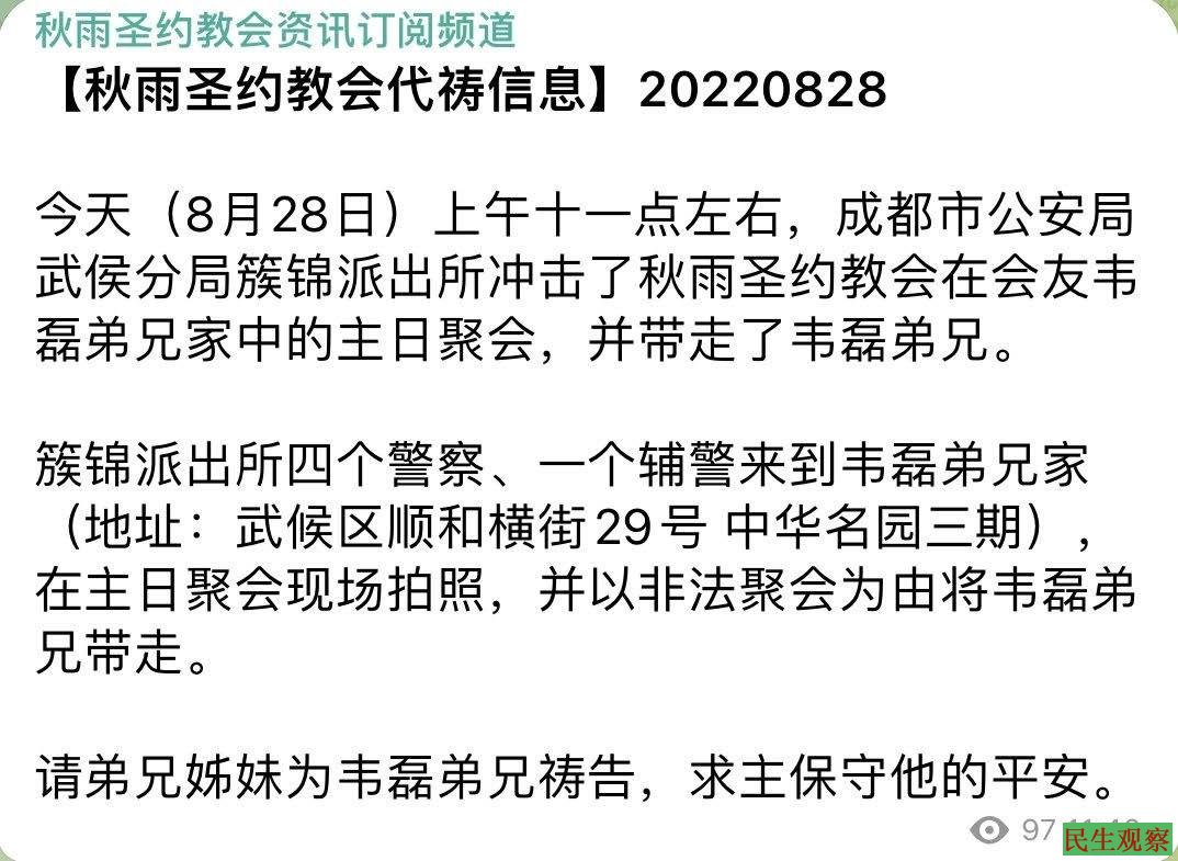 2022年8月28日秋雨圣约教会发出代祷信息:今天(8月28日)上午十一点左右,成都市公安局武侯分局簇锦派出所冲击了秋雨圣约教会在会友韦磊弟兄家中的主日聚会,并带走了韦磊弟兄。