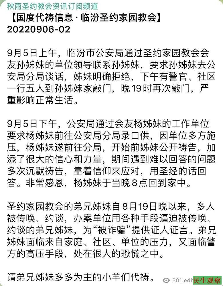 【民生观察2022年9月7日消息】自2022年8月19日晚以来,临汾圣约家园教会的弟兄姊妹,多人被传唤、约谈,办案单位用各种手段逼迫被传唤。约谈的弟兄姊妹,为教会两位传道“被诈骗”提供证人证言。