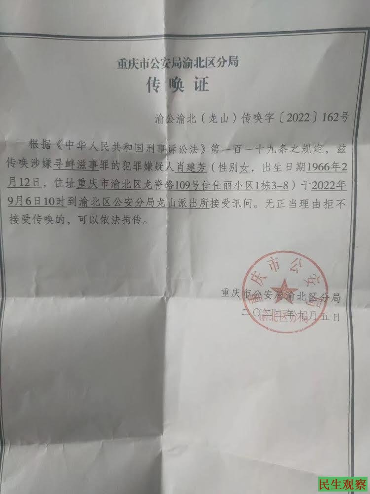 2、2022年9月6日,重庆维权人士肖建芳被重庆市公安局渝北区分局以涉嫌寻衅滋事罪传唤。据肖建芳儿子说:6日早上10:30分左右,派出所、专案组、街道的带着搜查令,传唤证,来家里搜查,12:30分把我母亲带走了,手机也被搜走了。