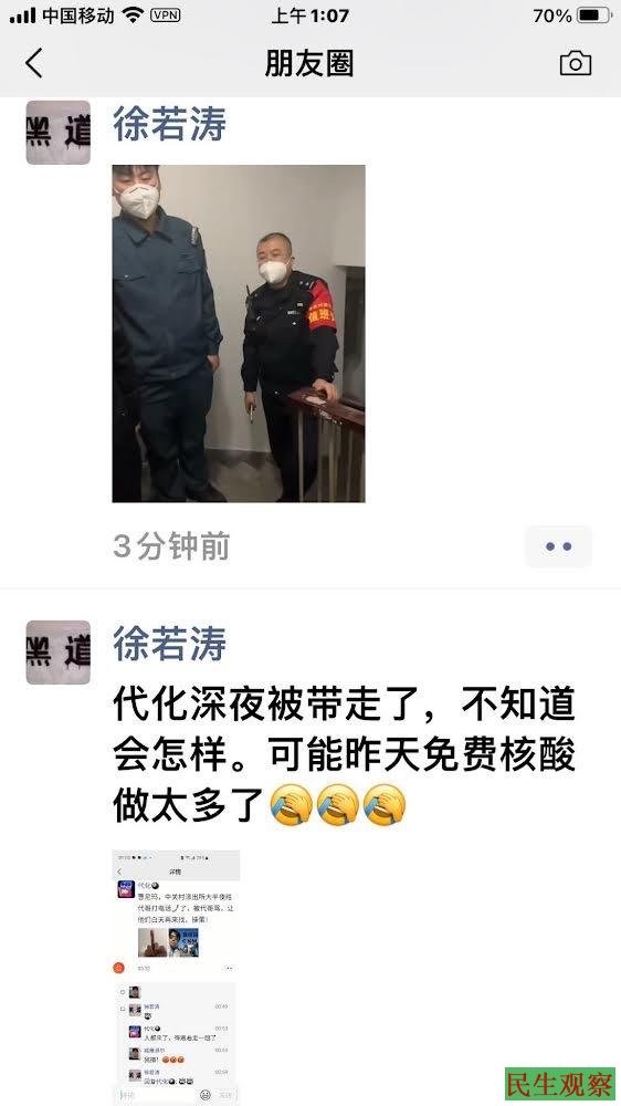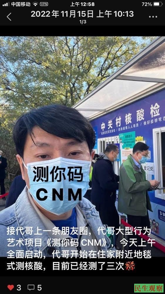 代化是北京的艺术家,前天朝九晚五地做核酸,走遍了他周围的核酸点,一天捅了几十次,全阴,不久就有三个警察找上门了。