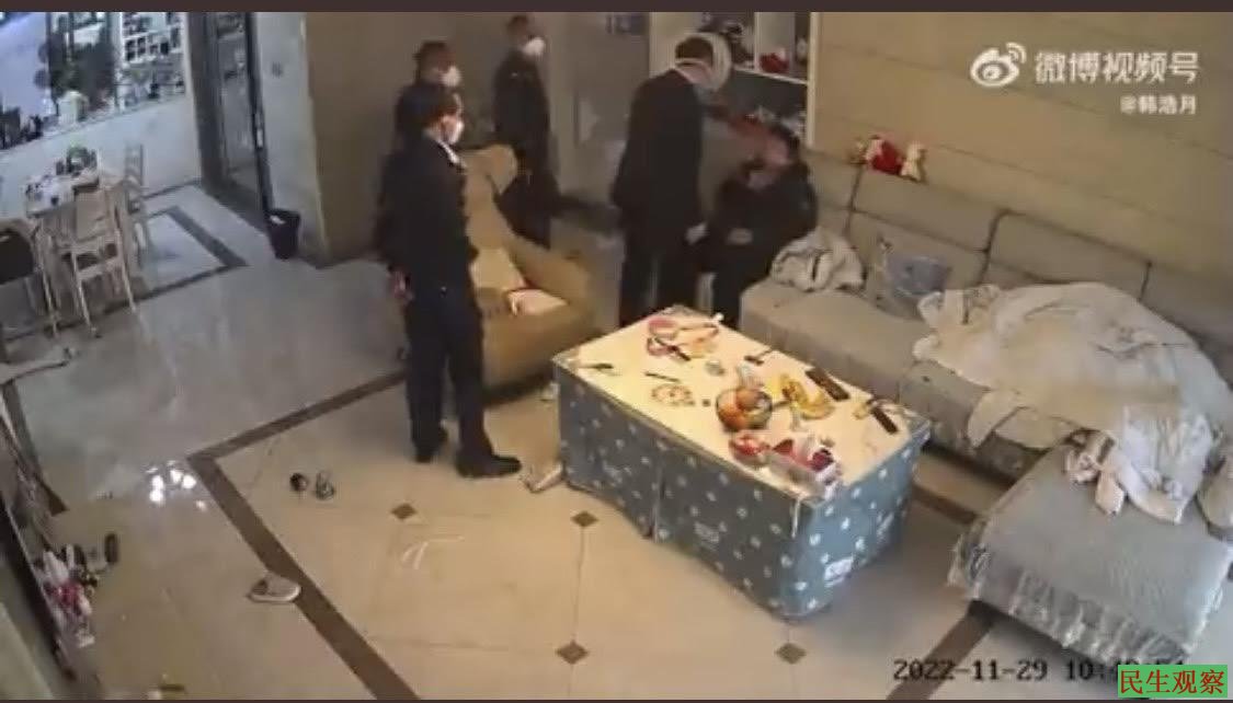 【民生观察2022年12月1日消息】2022年11月29日,湖南浏阳市荷花街道一业主,因为对所居住的浏阳水岸山城小区的防控措施提出疑议和建议,随后该辖区街道综合治理办廖主任,就带着三名警察来到该居民家里,当着孩子的面去殴打业主。后在得知业主家中安装有监控后,更是要求删除相关视频。
