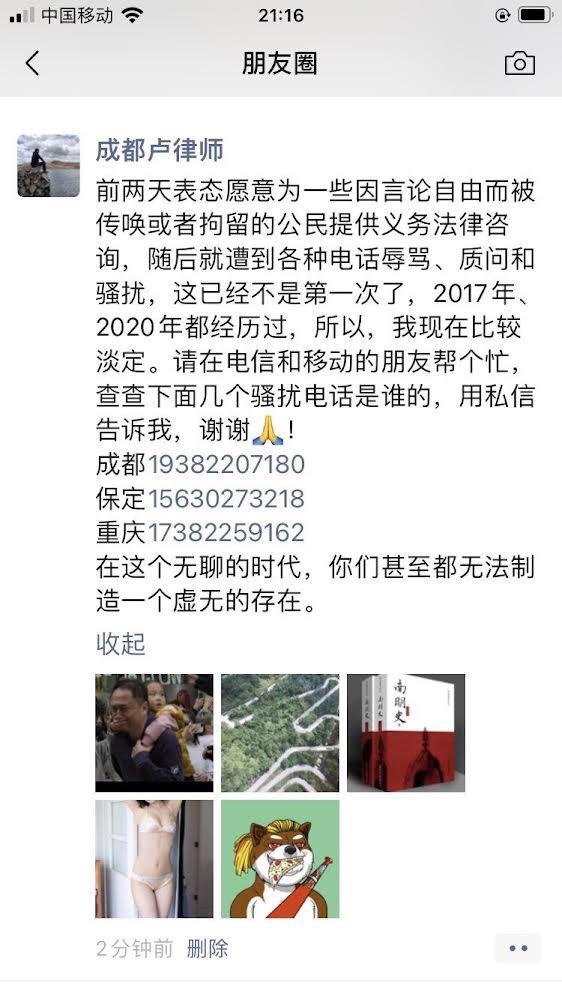 据卢律师发朋友圈说:前两天表态愿意为一些因言论自由而被传唤或者拘留的公民提供义务法律咨询,随后就遭到各种电话辱骂、质问和骚扰,这已经不是第一次了,2017年2020年都经历过,所以,我现在比较淡定。