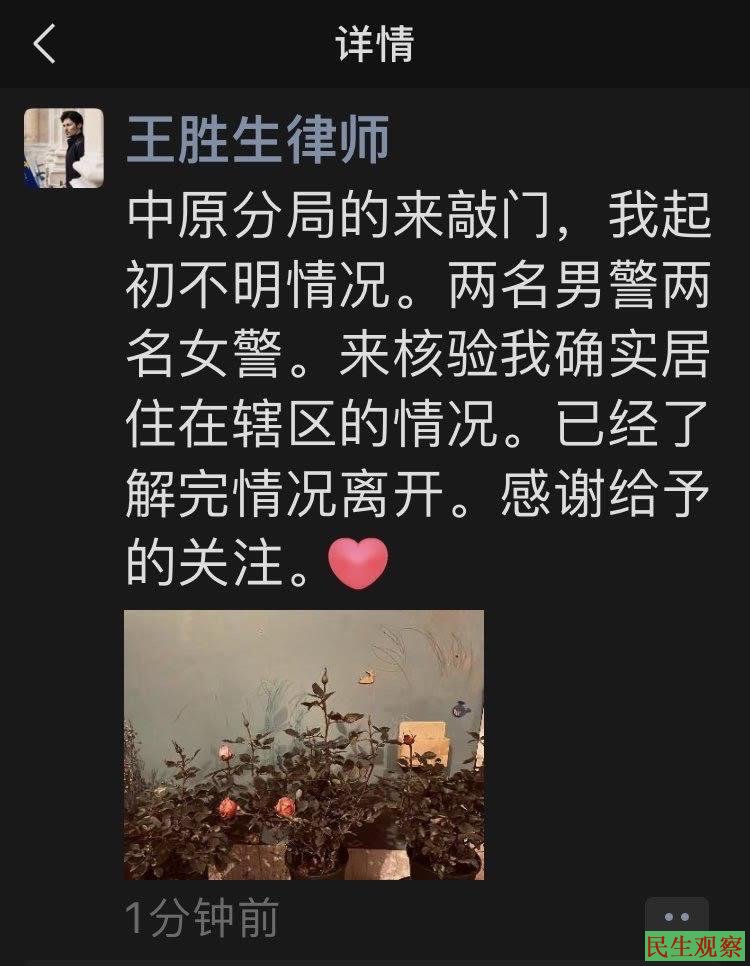 当日,王胜生律师发出消息说:“中原分局的来敲门,我穿上衣服看看怎么回事儿。我起初不明情况,两名男警两名女警,来核验我确实居住在辖区的情况,已经了解完情况离开。感谢给予的关注!”