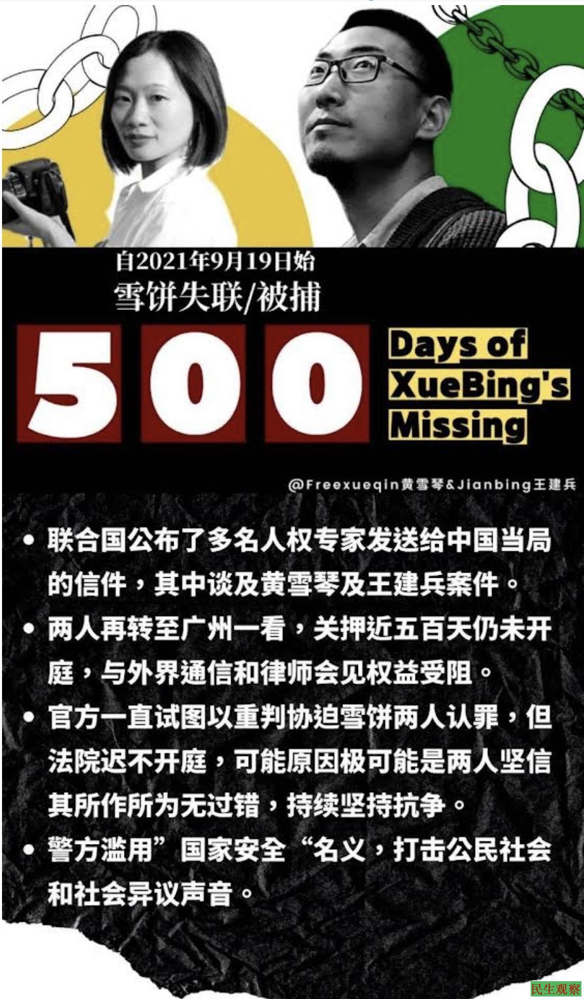 【民生观察2023年2月2日消息】黄雪琴、王建兵(雪饼)自2021年9月19日被捕失联后,至今被捕已近500天,今年在看守所度过了第二个春节。迄今,案件已经历多次退回侦查,仍僵持在法院阶段,未有开庭日期。俩人与外界通讯仍然受限,无法收到外界物品,近期也无法汇款;而因委托律师受阻,外界仍然难以获知黄雪琴的具体处境。