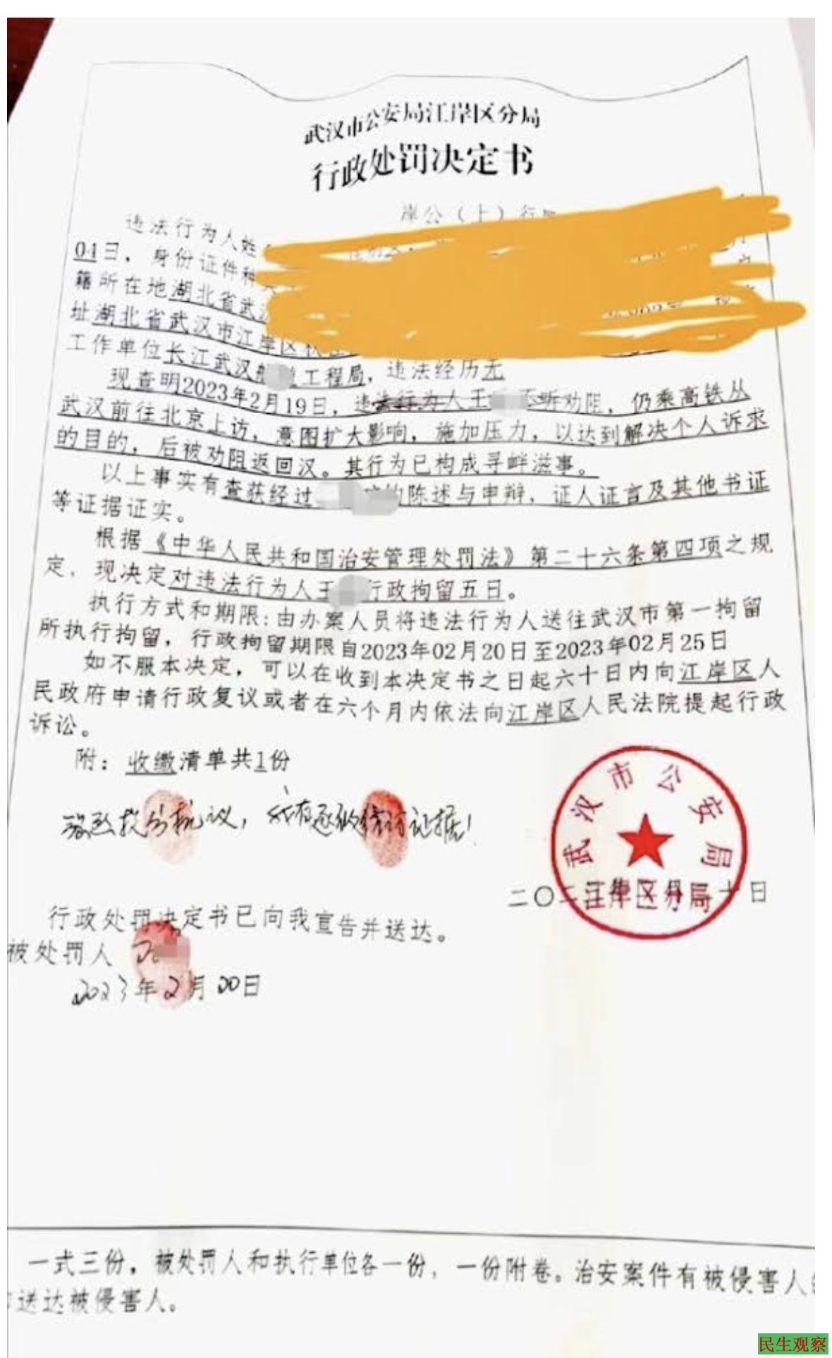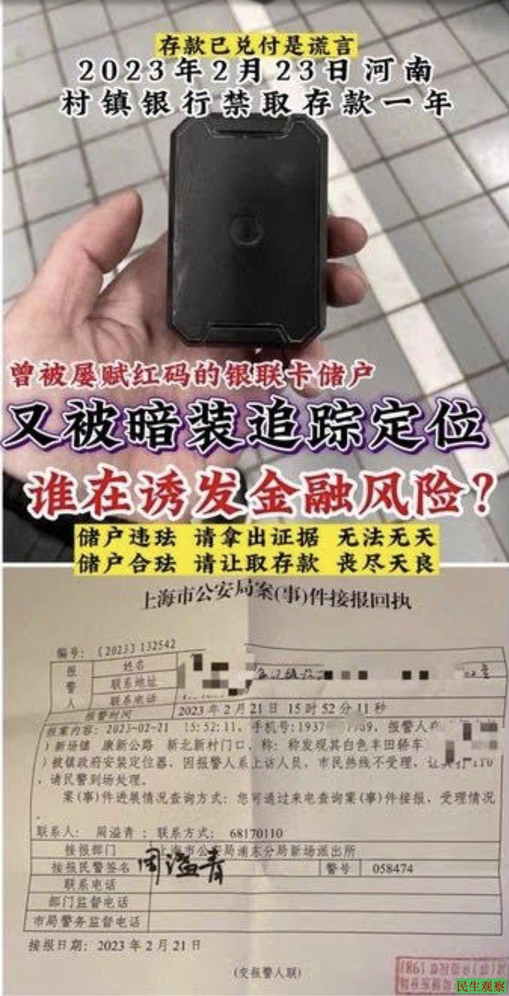 2023年2月19日,河南村镇银行武汉储户王某因去北京国家信访局上访被带回当地,第二天即被武汉警方行政拘留5天;上海储户的车被偷安追踪器,目前报警后警方已受理;绍兴储户家门口被安装24小时监控摄像头,非法限制其人身自由。据河南村镇银行储户反映,时至今日外地银联卡储户还分文未兑付。