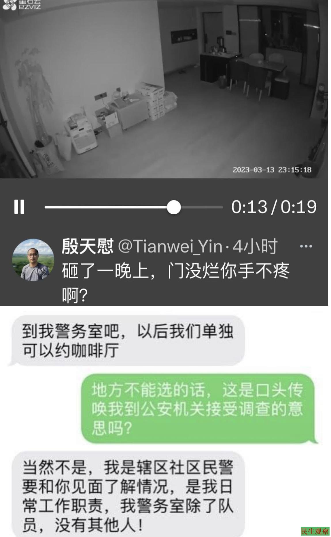 2023年3月13日晚十点开始,几个自称是南京市公安局栖霞派出所的人在殷天慰家门口进行砸门、威胁,但却拒绝出具传唤手续,对方称案子涉及国安。至14日晚间,殷天慰已被围困在家20多个小时无法出门。