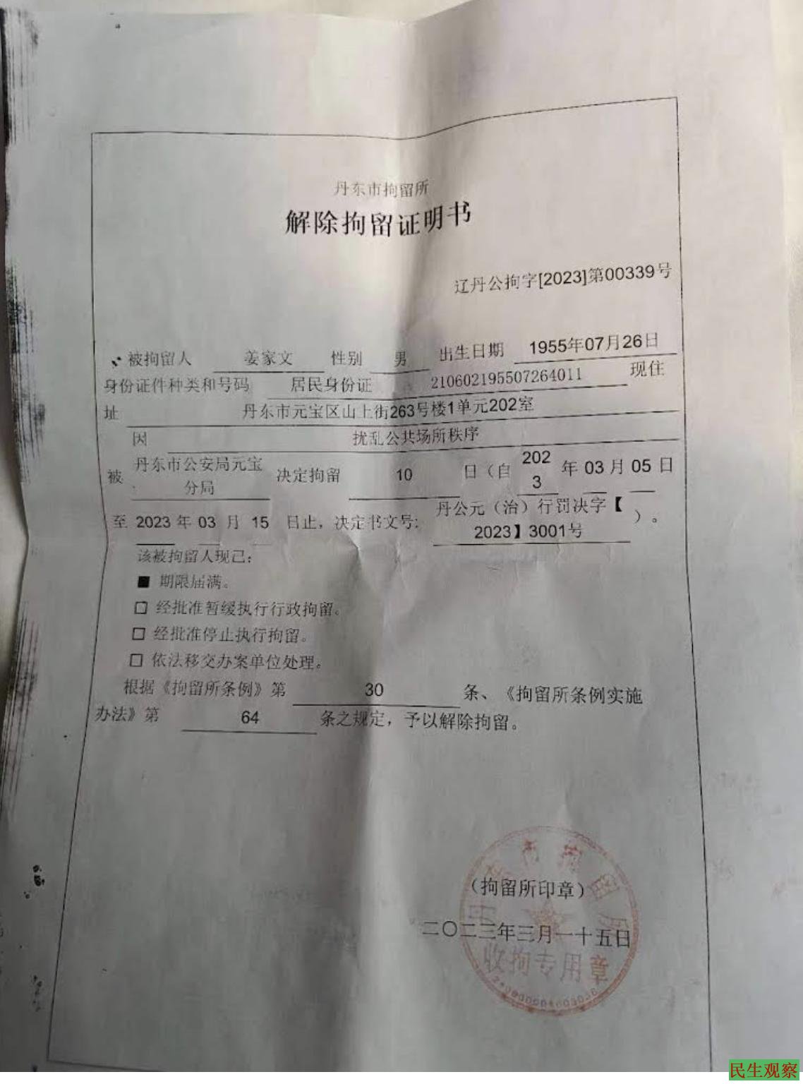 【民生观察2023年3月16日消息】辽宁省丹东市维权人士姜家文在中共两会召开期间3月5号当局以扰乱公共秩序罪将姜家文行政拘留10天,今天3月15日拘留期满解除行政拘留释放回家。他在失去信息后很多维权人士都在打听他的消息因为他的微信信息停留在3月4日,朋友说3月4号还与他通过话的,3月5号朋友就联系不上了,直到3月15日他拘留期满释放回家他才发出信息后朋友得知他已经“安全”回家。