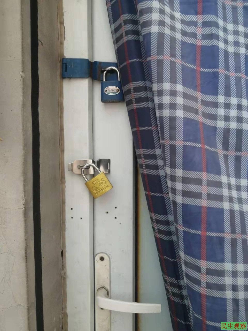 马波说:“我的门也被安了一道锁,我门上边原有一道蓝色门扣和蓝色的锁是我自己的,下面的白色门扣和黄锁是警察安装的。”