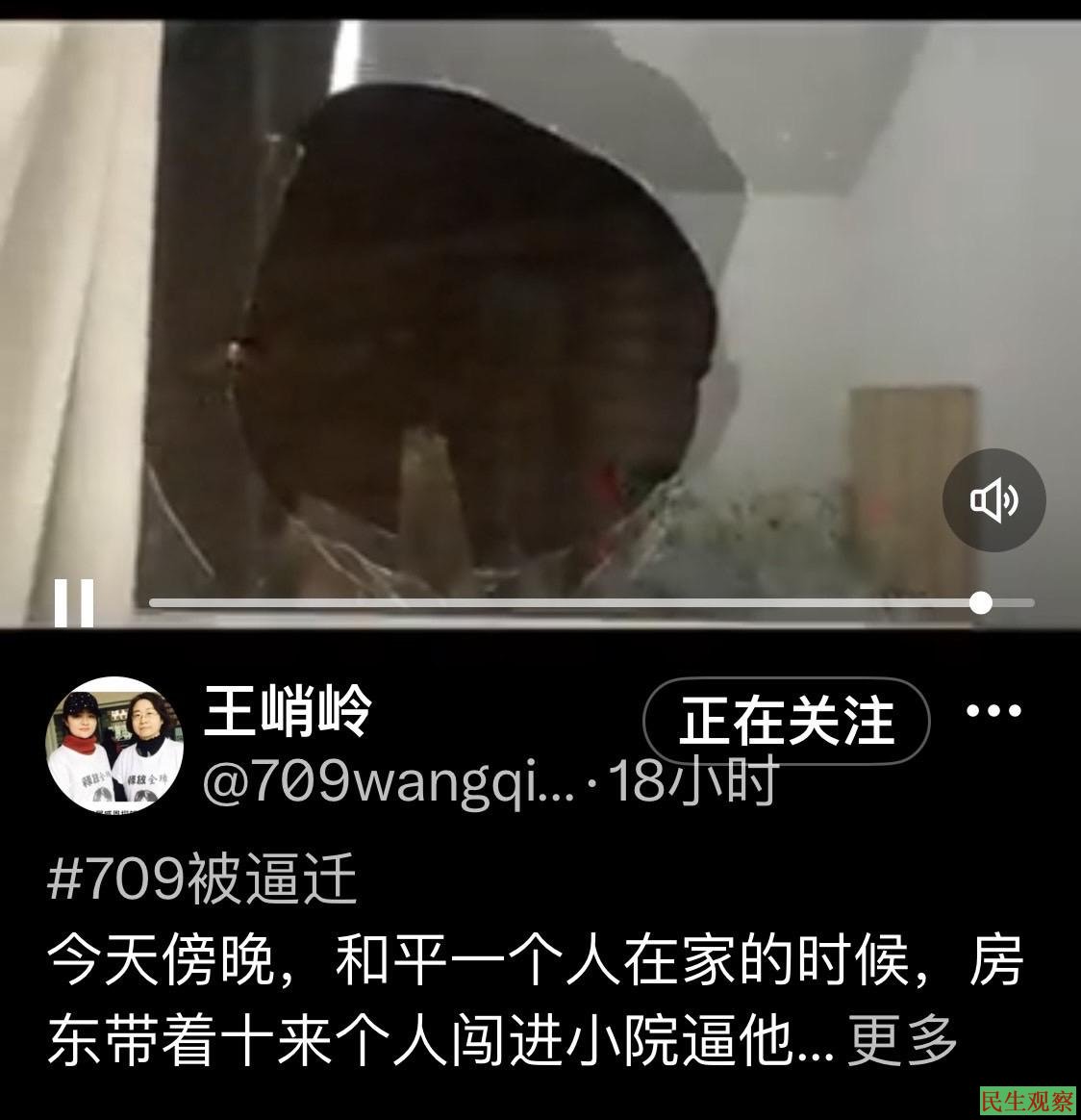 据李和平妻子王峭岭说,5月14日傍晚约7:24分,李和平一个人在家的时候,房东带着十来个人闯进小院逼他搬家,发出了“不走弄死你”的威胁。