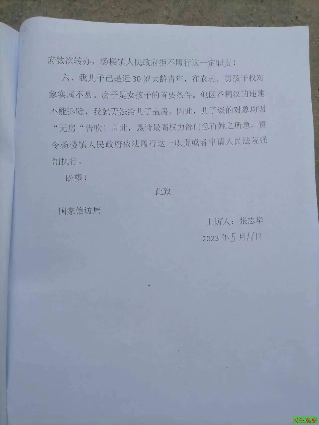 我上访反映:杨楼镇人民政府不履行法定职责,要求履行。事实理由如下: