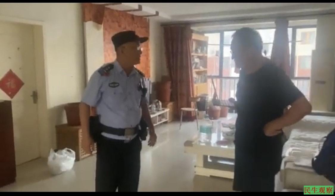 随后,两名民警和一名物业管理人员进屋查看,给两人各种逼迫。警察和物业管理人员在演双簧。物业管理人员罗列出两人各种问题,警察说两人对物业管理人员不尊重。警察自始至终没有出示执法文件,逼迫两人配合他们的不法行为。