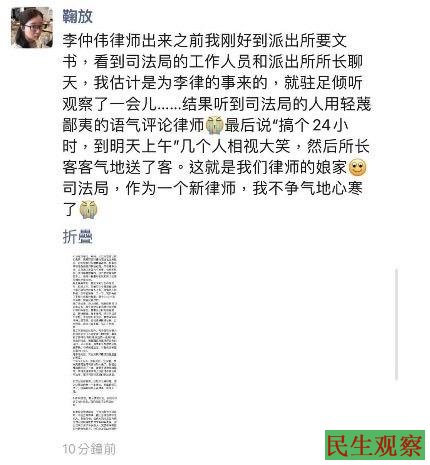 另外,当天在李仲伟律师获释出来之前,鞠放律师刚好到派出所要文书,看到司法局的工作人员和派出所所长聊天,估计是为李律的事来的,就驻足倾听观察了一会儿……结果听到司法局的人用轻蔑鄙夷的语气评论律师,最后说“搞个24小时,到明天上午”几个人相视大笑,然后所长客客气气地送了客。