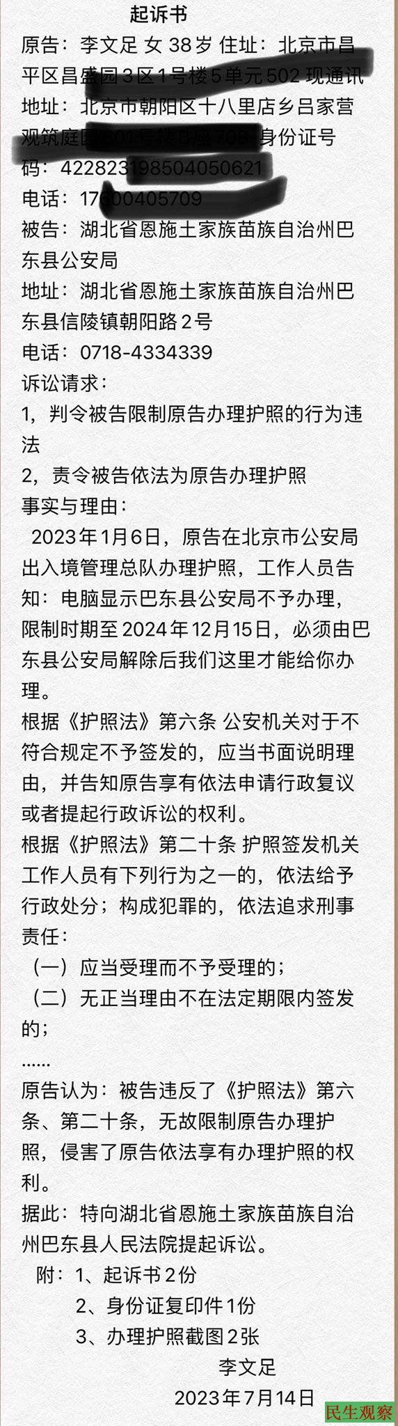 2023年7月14日,就湖北省巴东县公安局限制其办理护照的违法行为,李文足向巴东县人民法院邮寄了起诉书。
