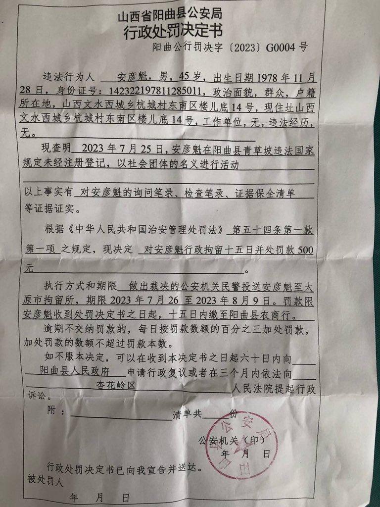 25日下午五点半左右,青少年夏令营会遭到阳曲县警方、民宗局等人员的闯入,安彦魁传道、王应杰弟兄和妻子王瑛姐妹、张乘豪弟兄共4人,被带到阳曲县黄寨派出所问话。26日得知4人被行政拘留15天。