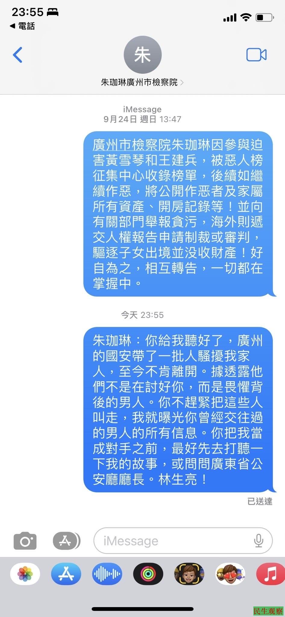 鉴于广州政保不离开,持续对自己家人进行骚扰的行为,11日晚上,林生亮给广州市检查院朱珈琳手机发出如下信息:朱珈琳,你给我听好了,广州的国安带了一批人骚扰我家人,至今不肯离开。据透露他们不是在讨好你,而是畏惧背后的男人。你不赶紧把这些人叫走,我就曝光你曾经交往过的男人的所有信息。你把我当成对手之前,最好先去打听一下我的故事,或问问广东省公安厅厅长。林生亮!
