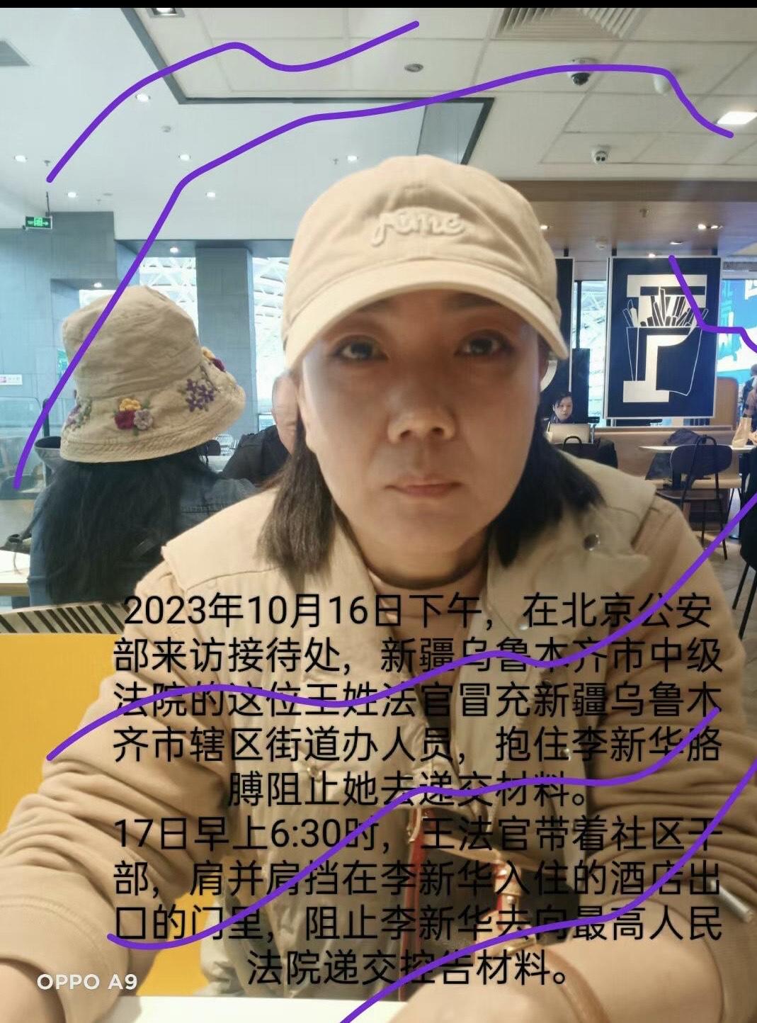 2023年10月16日下午,李霖母亲李新华在北京欲递交上访材料,乌鲁木齐市中级法院王奕丁法官冒充龙盛街管委会人员,抱住李新华胳膊阻止她去公安部递交材料;10月17日一大早,带着社区干部挡在李新华入住的酒店出口处,阻止她向最高法院递交控告材料。