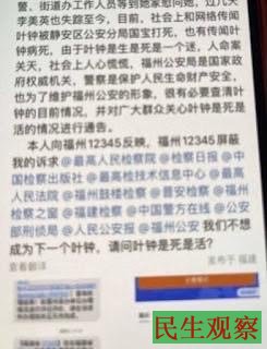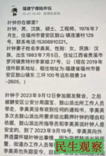 【民生观察2023年10月25日消息】2023年10月24日,是福建硕士访民叶钟死讯传出的第9天,其妻李美英仍失踪,当局继续封杀福州维权公民质疑声音。近日,福建屏南公民陆祚钰就叶钟死亡传言向福建12345平台投诉,被平台删除,将同样内容转发到微博上,竟被福州晋安区警方找上门逼删微博。