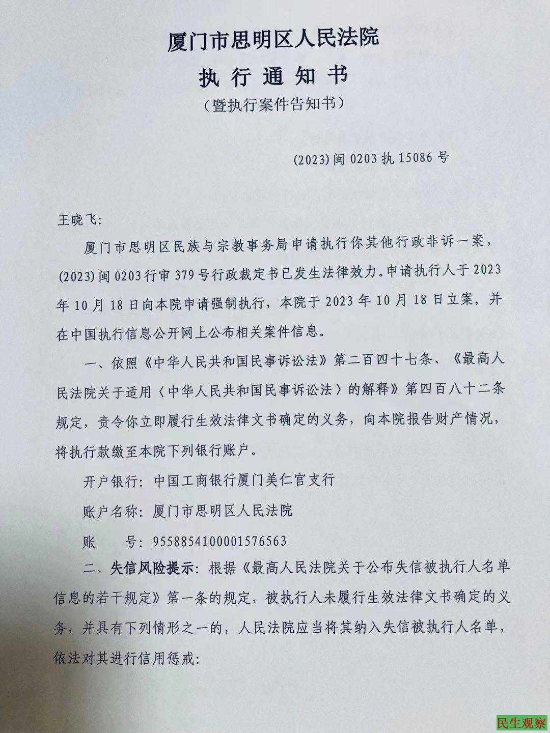 厦门市思明区法院“执行通知书”称,厦门市思明区民族与宗教事务局申请执行王晓飞其他行政非诉一案,(2023)闽0203行审379号行政裁定书已发生法律效力,厦门市思明区民族与宗教事务局于2023年10月18日向该院申请强制执行,该院于2023年10月18日立案,并在中国执行信息公开网上公布相关案件信息: