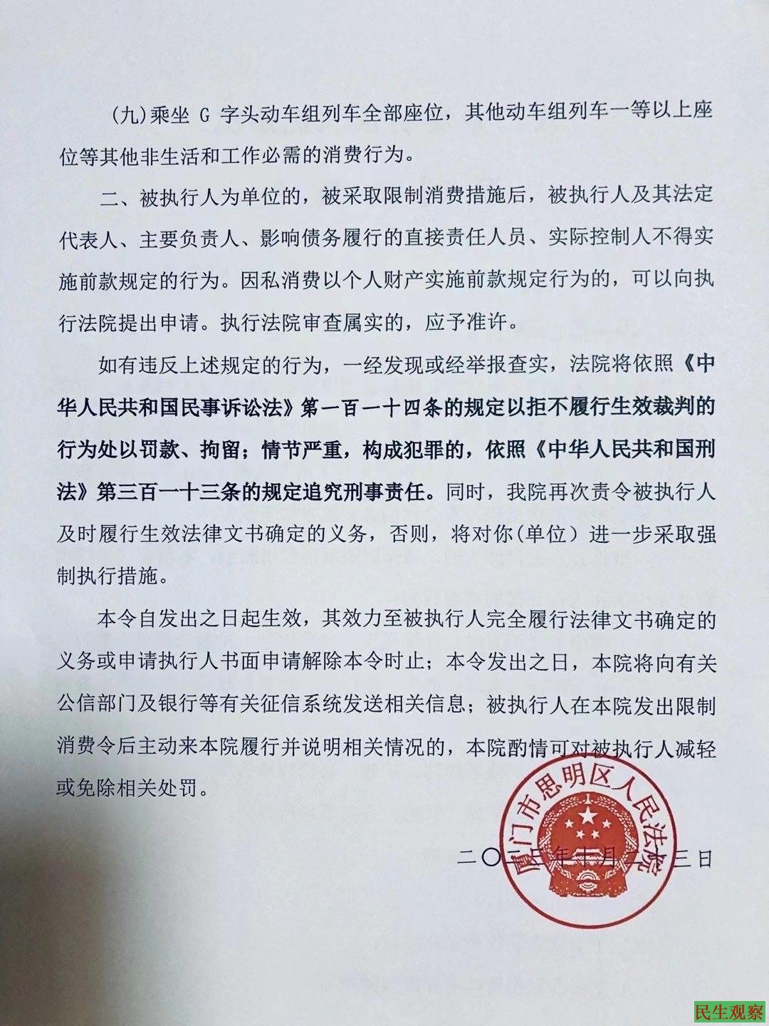 厦门市思明区法院“限制消费令”称,申请执行人厦门市思明区民族与宗教事务局与被执行人杨希伯、王晓飞其他行政非诉一案,因被执行人杨希伯、王晓飞未履行生效法律文书确定的义务,根据《最高人民法院关于限制被执行人高消费及有关消费的若干规定》,本院决定对二人采取限制消费措施,责令二人必须遵守如下规定: