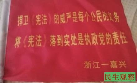 张朝晖举旗帜内容为:“捍卫《宪法》的尊严是每个公民的义务,将《宪法》落到实处是执政党的责任”;另一面旗除相同内容外,有一“冤”字。